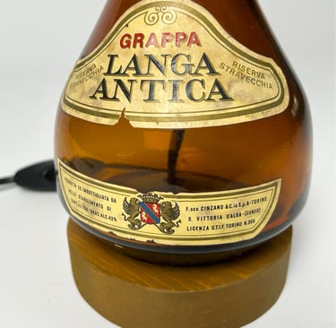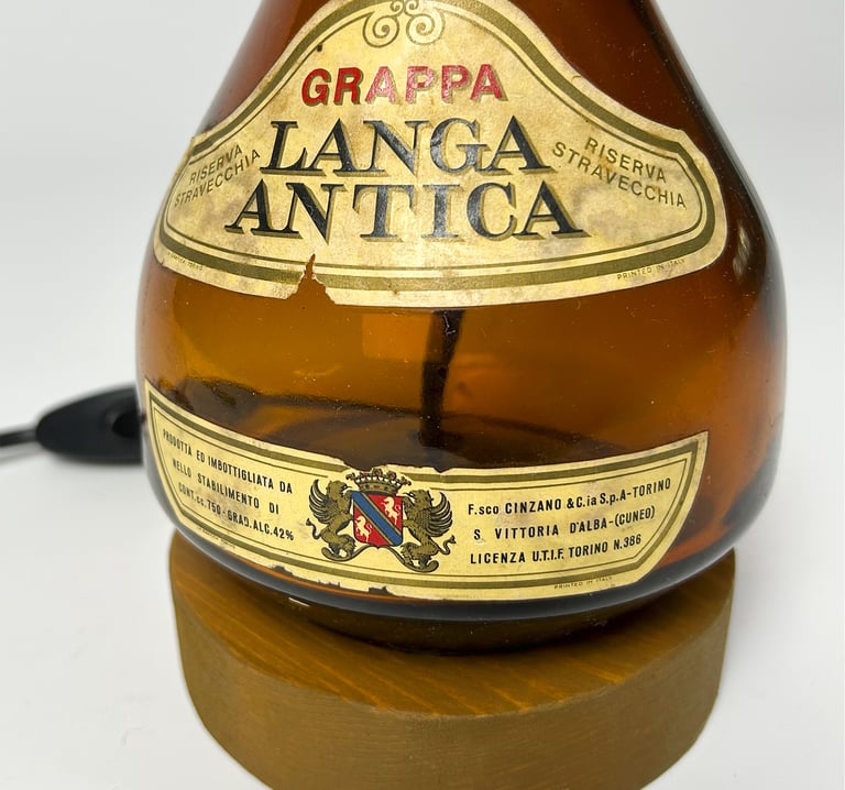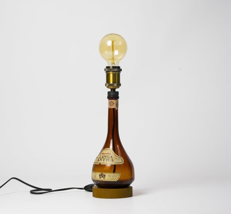 Il vetro ambrato della bottiglia di grappa diventa la base calda e raffinata della lampada, mentre il design mette in risalto l’etichetta dal fascino d’altri tempi. Un oggetto che porta con sé il sapore e la tradizione delle Langhe, trasformato in un elemento di luce e stile.