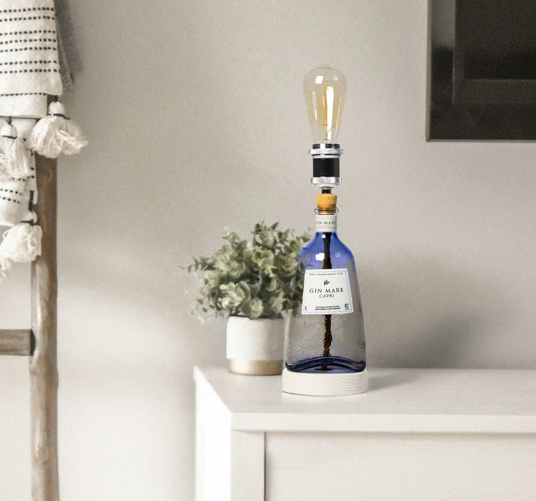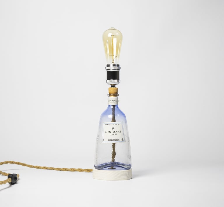 La freschezza delle botaniche mediterranee illumina la bottiglia di Gin Mare.Una lampada perfetta per ambienti rilassati, terrazze e spazi con vista mare.